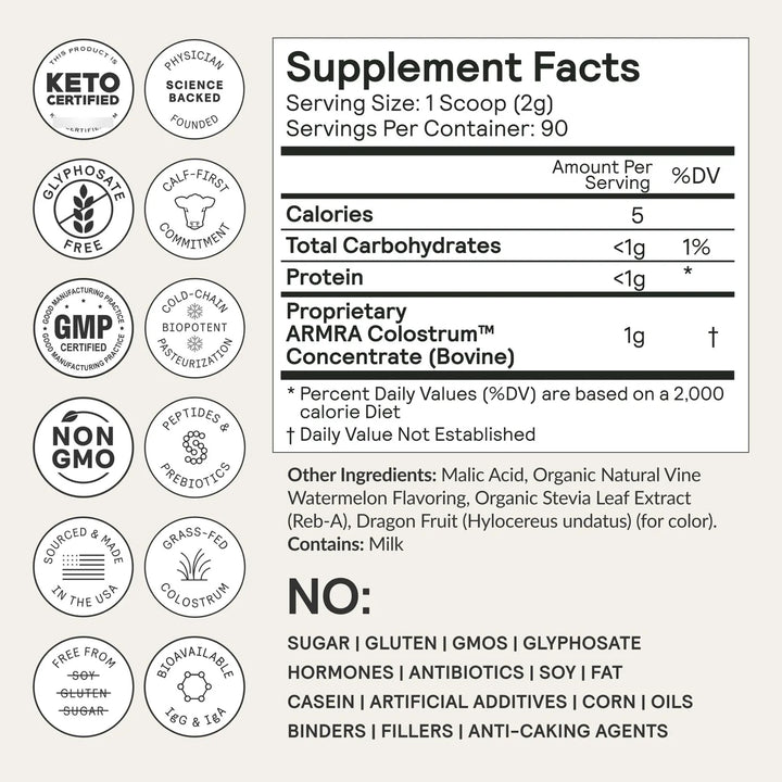 Con más de 400 nutrientes bioactivos, este concentrado de calostro bovino alimentado con hierba es la fórmula más pura y potente disponible. ¿Por qué conformarte con menos cuando puedes darle a tu cuerpo lo que realmente necesita? La tecnología patentada de pasteurización BioPotent asegura que cada gramo conserve su potencia cruda, maximizando la biodisponibilidad para que tu cuerpo absorba cada beneficio al instante.