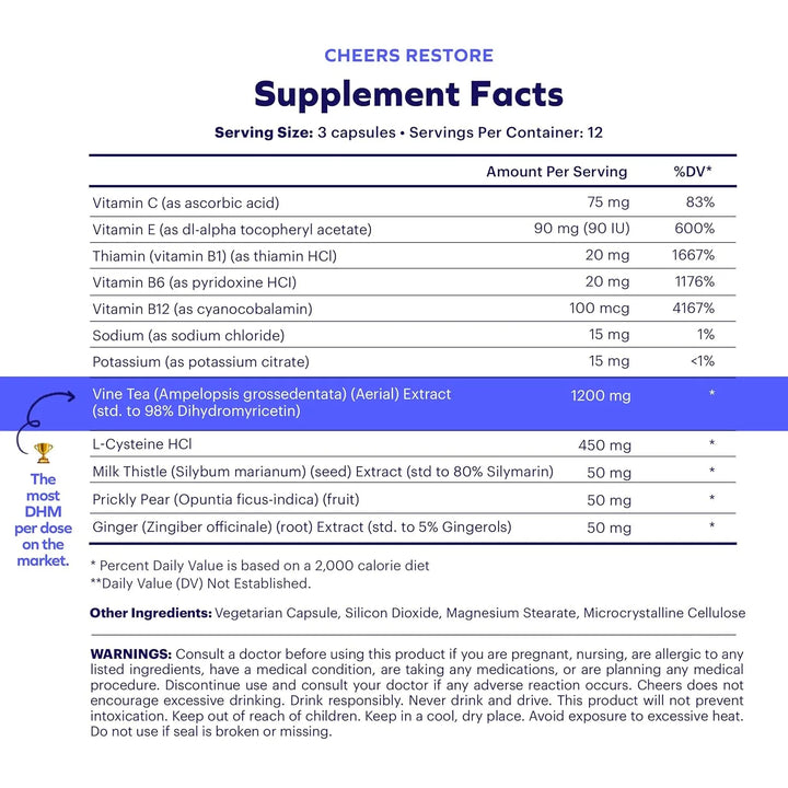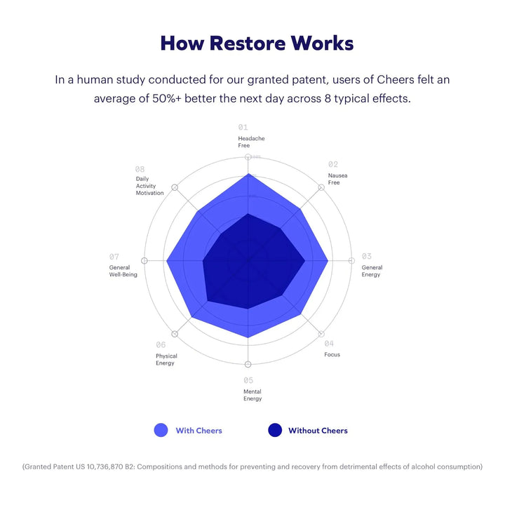 - Toma 2 píldoras Restore antes de dormir después de beber.