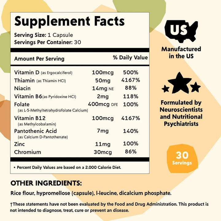 El Complejo B Metilado actúa directamente en la producción de neurotransmisores esenciales para el bienestar emocional y físico. Las vitaminas B metiladas (como B12 y folato) son clave para convertir los alimentos en energía, reducir la fatiga y apoyar la función cognitiva. Además, los cofactores incluidos en la fórmula optimizan la síntesis de serotonina y dopamina, neurotransmisores vinculados al estado de ánimo y la motivación.