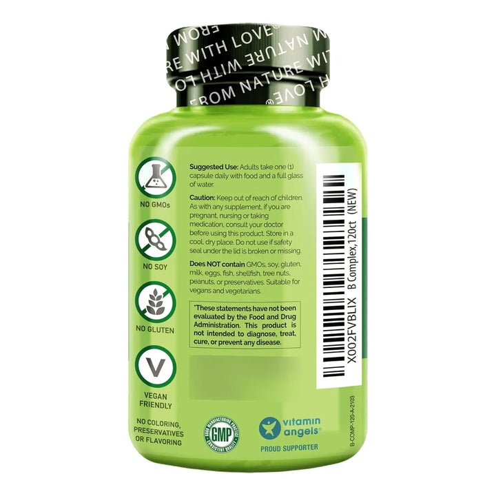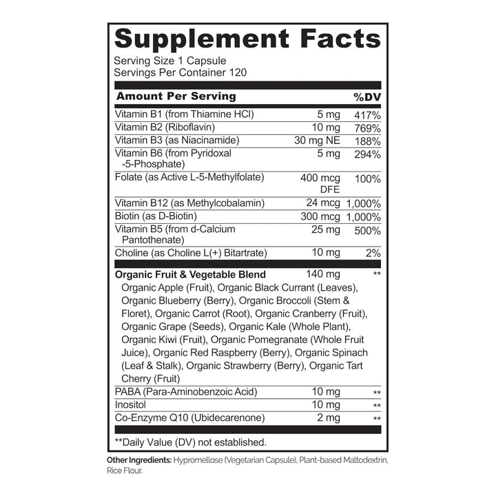 Olvídate de esos complejos B que prometen mucho pero no cumplen. Nuestra fórmula única combina lo mejor de la ciencia y la naturaleza: vitaminas en sus formas más biodisponibles + un poderoso blend orgánico de frutas y verduras. Es como darle a tu cuerpo un multivitamínico y un superalimento en uno solo. Y lo mejor: cero ingredientes artificiales, cero alergenos comunes, 100% limpio y vegano.