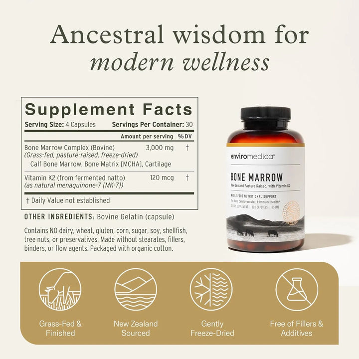 El Complejo de Médula Ósea Liofilizada trabaja desde la primera dosis. Los nutrientes son absorbidos rápidamente por tu cuerpo, comenzando a nutrir tus articulaciones, huesos y sistema inmunológico. La vitamina K2 MK7 asegura que el calcio se dirija a tus huesos y no a tus arterias, mientras que el cartílago bovino y el colágeno promueven la regeneración de tejidos.