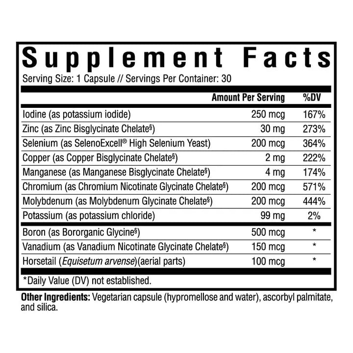Este poderoso suplemento contiene 10 oligominerales esenciales, cuidadosamente seleccionados para brindarte un apoyo integral a tu salud. El selenio, zinc, yodo y cobre trabajan en sinergia para fortalecer tus defensas, mientras que otros minerales como el molibdeno apoyan la función de neurotransmisores clave para tu bienestar mental y emocional. Y lo mejor de todo: está especialmente formulado sin hierro, haciéndolo perfecto para quienes necesitan evitar este mineral en su dieta.
