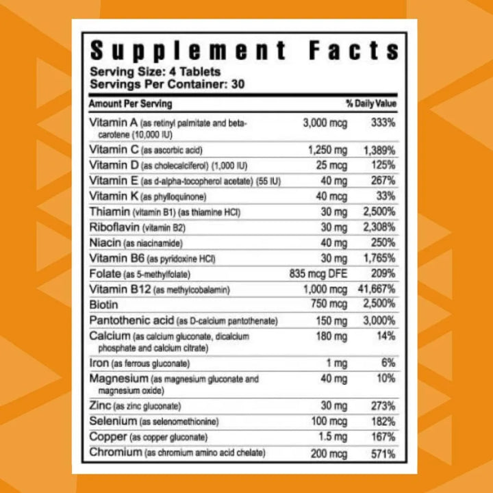 Este multivitamínico actúa como un refuerzo nutricional completo. Al tomar una tableta diaria, tu cuerpo recibe una dosis concentrada de vitaminas, minerales y antioxidantes que trabajan sinérgicamente para mejorar tu energía, fortalecer tu sistema inmunológico y proteger tus células del daño oxidativo. La fórmula está diseñada para ser altamente absorbible, lo que significa que cada nutriente llega donde más lo necesitas.