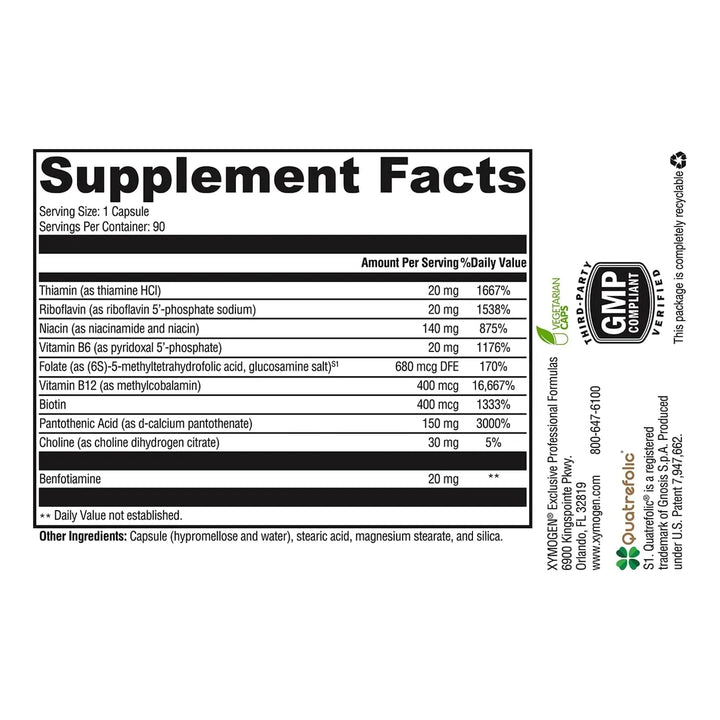 Este producto trabaja a nivel celular: las vitaminas B activas actúan como coenzimas esenciales en procesos como la producción de energía, la síntesis de neurotransmisores y la desintoxicación. La benfotiamina y el metilfolato optimizan la función mitocondrial, mientras que la B12 (metilcobalamina) protege las neuronas y reduce la fatiga. La colina citrato potencia estos efectos, apoyando la memoria y la función hepática.