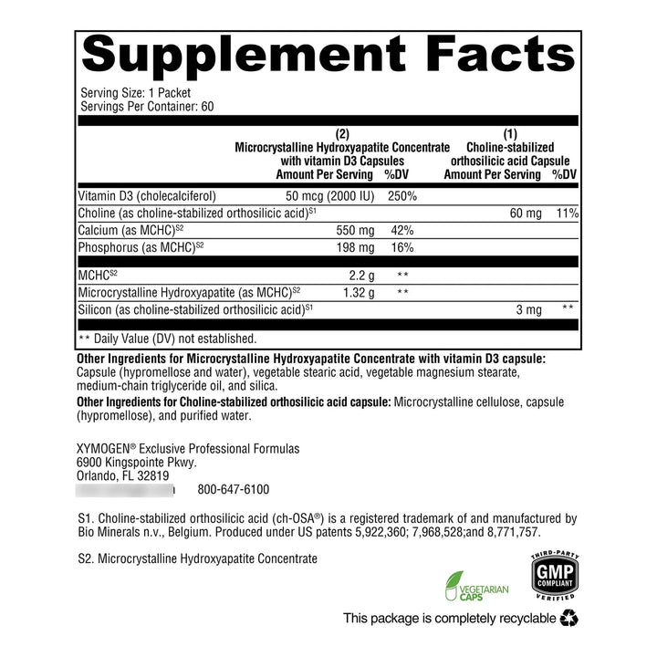 La hidroxiapatita microcristalina es una forma altamente biodisponible de calcio, esencial para mantener la estructura y fuerza ósea. Pero esto no es todo: este concentrado también incluye vitamina D3, que mejora la absorción del calcio, y ácido ortosilícico estabilizado con colina, un compuesto clínicamente probado para apoyar la salud ósea. Juntos, estos ingredientes trabajan sinérgicamente para brindarte huesos más fuertes y resistentes.