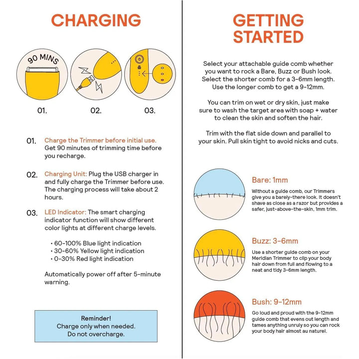 La cortadora Meridian utiliza un sistema de cuchillas de alta precisión combinado con un protector de cerámica que evita el contacto directo con la piel. Esto permite recortar el vello justo por encima de la superficie, dejando un acabado suave sin irritaciones. Su motor potente corta incluso el vello más grueso, mientras que su diseño ergonómico facilita el acceso a todas las áreas del cuerpo.