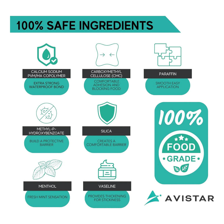 - 🛡️ Protección Superior: Sella eficazmente los alimentos, reduciendo la irritación de las encías hasta cinco veces más que otros adhesivos.