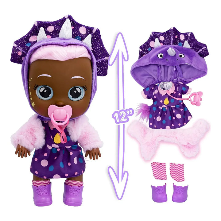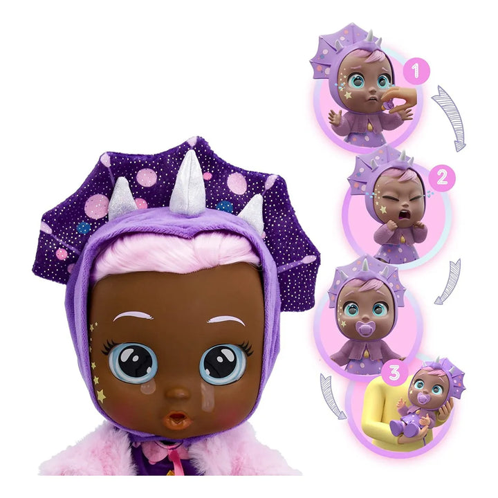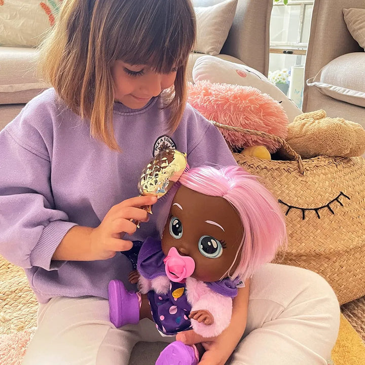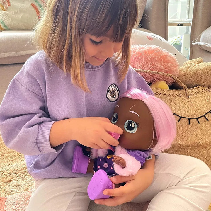 Phoebe utiliza un mecanismo interno que simula lágrimas reales al inclinarla suavemente, creando una experiencia interactiva única. Sus ojos expresivos y movimientos naturales captan la atención de los niños, invitándolos a cuidarla y jugar roles.