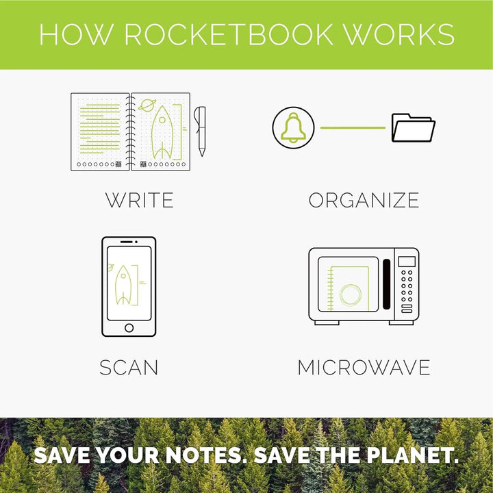 El cuaderno utiliza páginas especializadas que retienen la tinta de los bolígrafos Pilot Frixion. Una vez que tus notas están listas, la aplicación Rocketbook escanea el contenido gracias a su tecnología de IA, permitiéndote organizar, buscar y compartir tus ideas al instante. Para borrar, simplemente calienta el cuaderno en el microondas y las páginas quedarán como nuevas.
