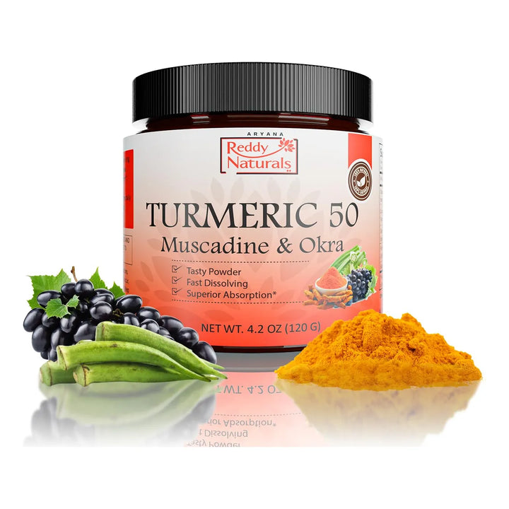 Aryana Turmeric 50 Suplemento orgánico de cúrcuma en polvo con uva muscadina y extracto de okra Fórmula de disolución rápida para la salud de las articulaciones y el apoyo