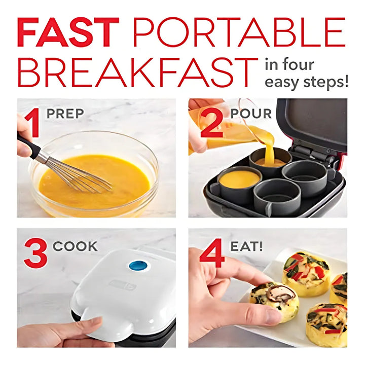El Egg Bite Maker calienta los ingredientes de manera uniforme, simulando el método sous vide sin necesidad de baños de agua. Simplemente mezcla tus huevos con los ingredientes favoritos, vierte en los moldes, colócalos en la máquina y en minutos tendrás un desayuno gourmet. Las tazas de silicona antiadherentes garantizan que cada bocado mantenga su forma perfecta.