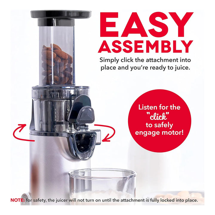 El exprimidor utiliza tecnología de prensado en frío para romper lentamente las fibras de frutas y verduras, liberando así más nutrientes y evitando la oxidación. A diferencia de los exprimidores centrífugos, no genera calor, lo que preserva las enzimas y vitaminas esenciales. Simplemente corta los ingredientes en trozos de 1 pulgada, introdúcelos en la bandeja y deja que el motor haga el resto. ¡El jugo más puro y nutritivo está a solo unos pasos!