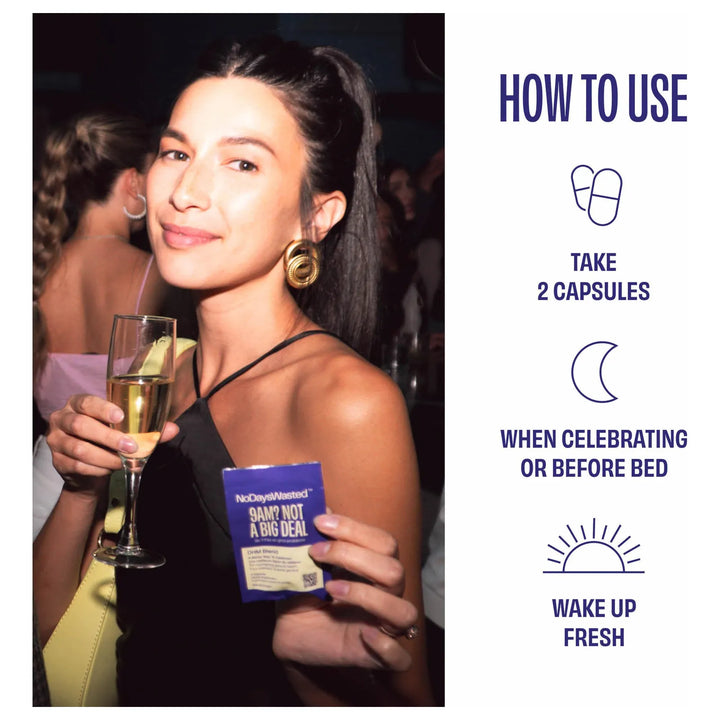 - Toma 2 cápsulas con un vaso de agua antes de acostarte después de consumir alcohol.