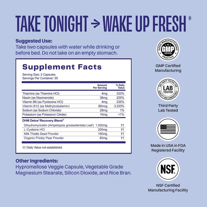 Este poderoso suplemento combina ingredientes naturales como dihidromiricetina (DHM), cardo mariano, tuna espinosa y vitaminas B, trabajando en sinergia para apoyar tu cuerpo mientras descansas. No más días perdidos por culpa de la resaca; solo experiencias memorables y mañanas llenas de vitalidad.