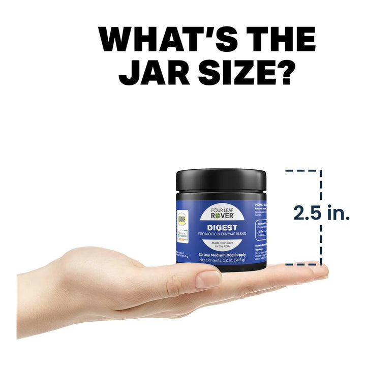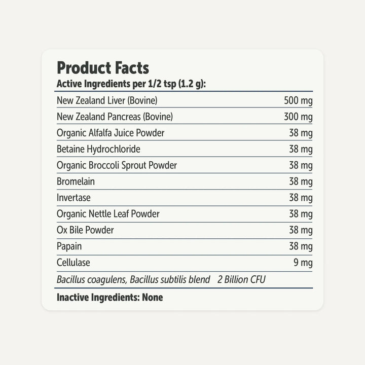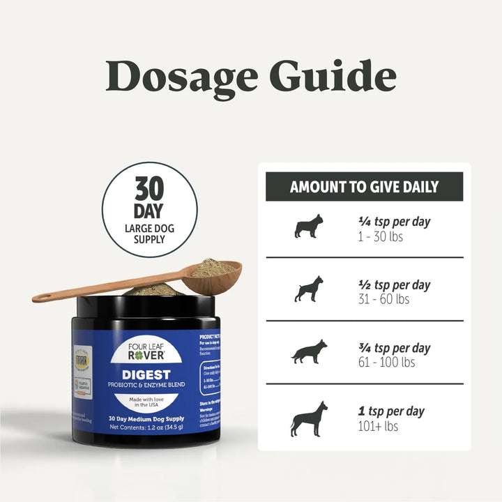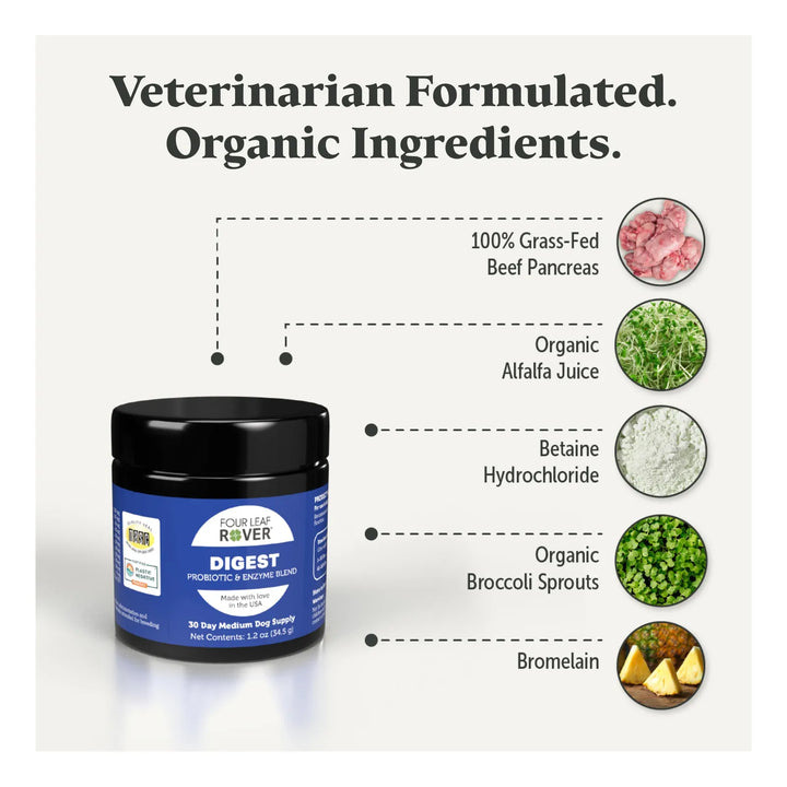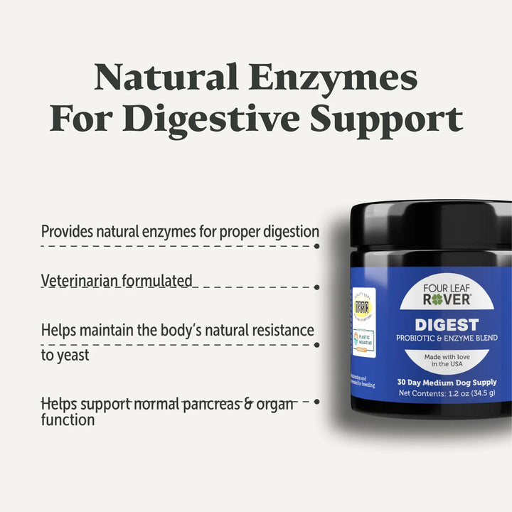 Imagina ver a tu compañero canino lleno de vitalidad, disfrutando cada comida sin molestias y absorbiendo todos los nutrientes que necesita. Con Digest, esto es posible gracias a su combinación única de enzimas digestivas derivadas de páncreas bovino de Nueva Zelanda alimentado con pasto y probióticos a base de suelo que fortalecen su flora intestinal.