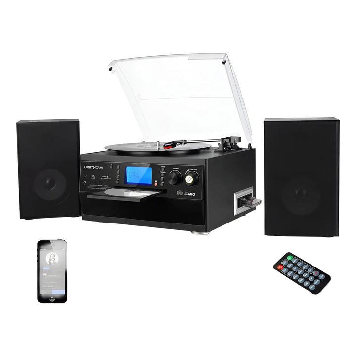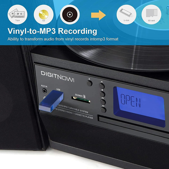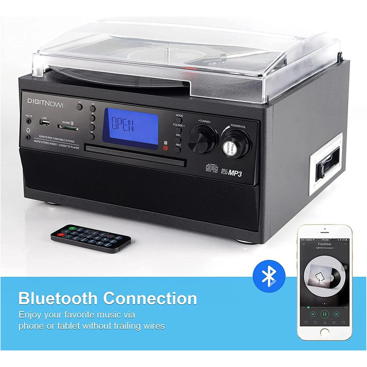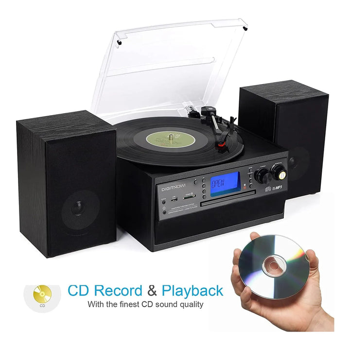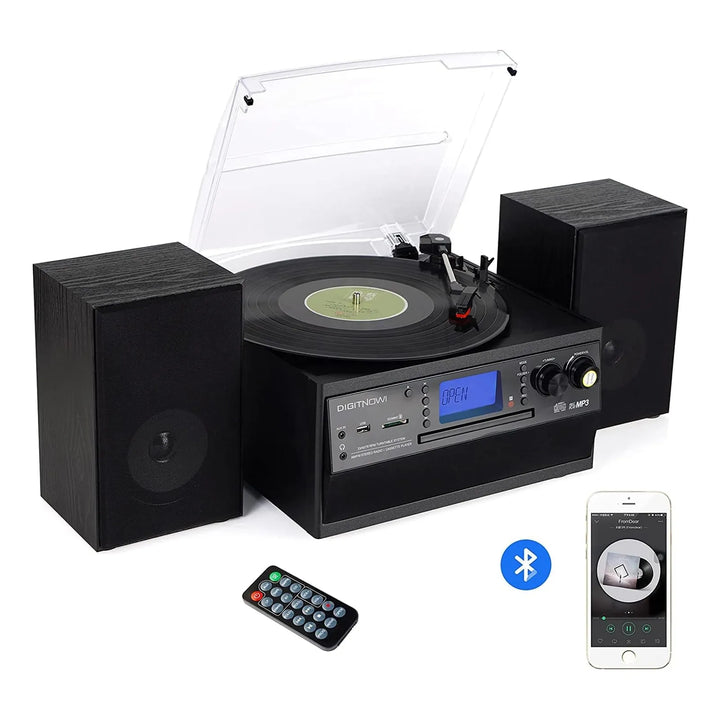 El tocadiscos Digitnow transforma tus vinilos en archivos MP3 mediante un proceso sencillo: coloca el disco en la plataforma, selecciona la velocidad (33, 45 o 78 RPM) y conecta una tarjeta USB o SD para grabar. El equipo se encarga del resto, garantizando un sonido claro y sin ruido. Además, su función Bluetooth te permite transmitir música desde tu teléfono o computadora, mientras que los altavoces desmontables ofrecen una experiencia auditiva personalizada.