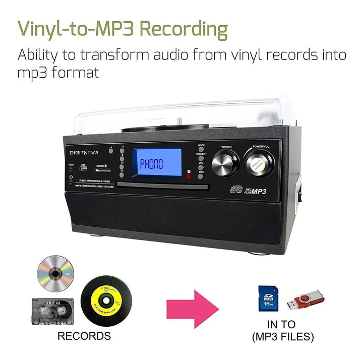 ¿Recuerdas la emoción de escuchar tus discos de vinilo favoritos? Con el tocadiscos Digitnow, no solo revivirás esos momentos especiales, sino que también podrás digitalizar tus canciones preferidas para disfrutarlas en cualquier dispositivo. Imagina poder convertir tus vinilos en archivos MP3 con solo presionar un botón, sin complicaciones y con la mejor calidad de sonido. Este es el reproductor multimedia que estabas esperando.
