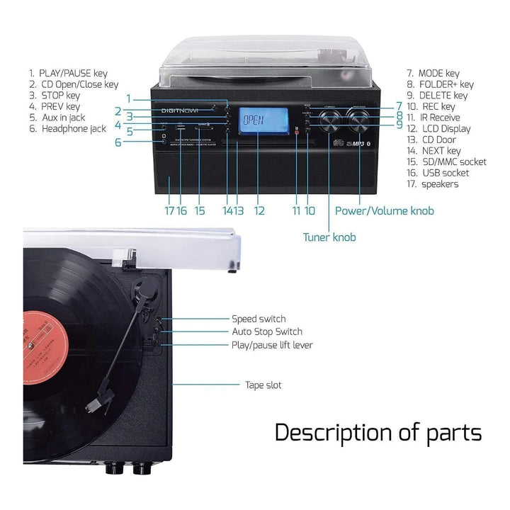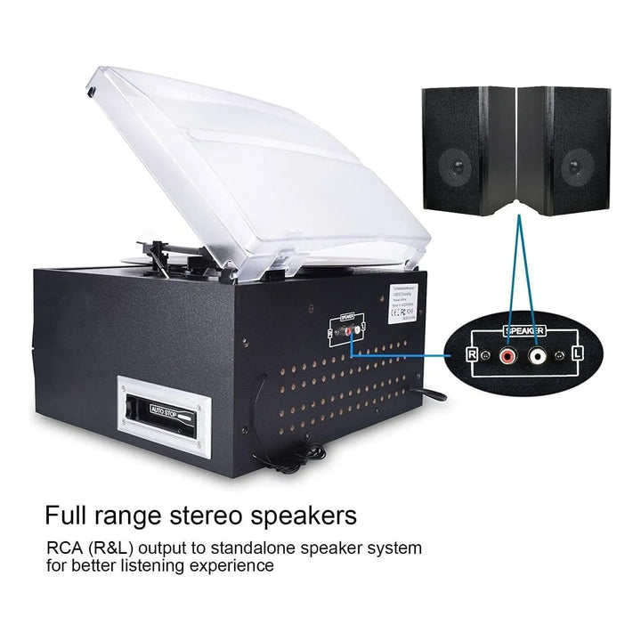 - 🔄 Compatibilidad múltiple: Funciona con vinilos, CDs, cassettes y dispositivos Bluetooth.