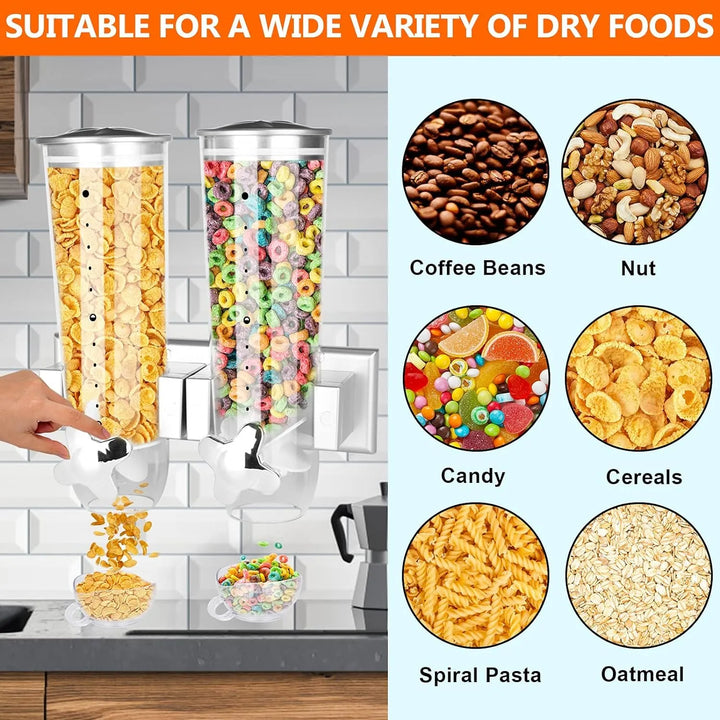 Este producto transforma tu experiencia de almacenamiento mediante un sistema inteligente: la comida se libera girando el botón, que activa una rueda de paletas para dispensar la cantidad exacta en la taza incluida. La entrada y salida separadas evitan contaminación, mientras que el diseño montado en pared libera espacio en mesadas.