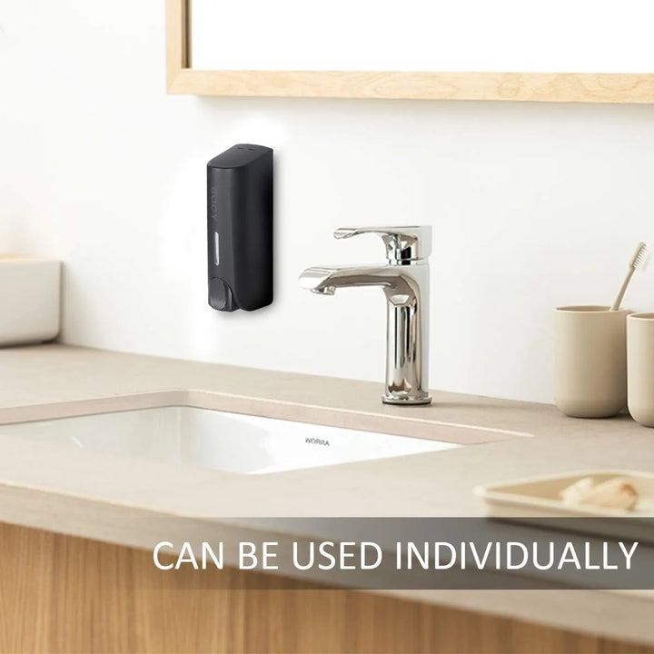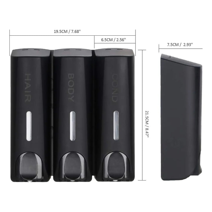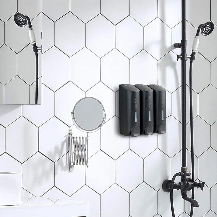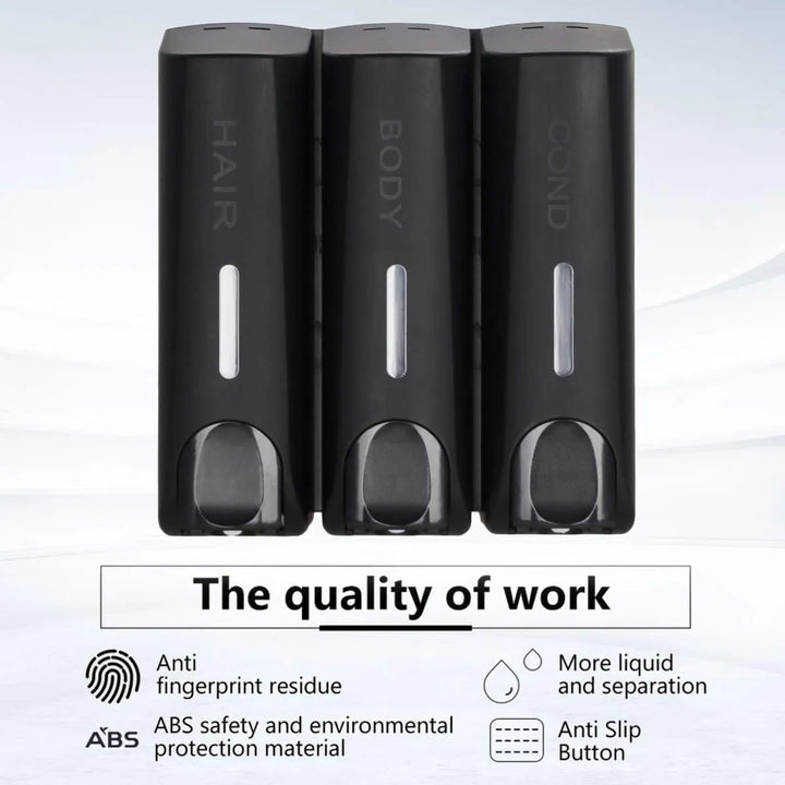 El dispensador está diseñado para optimizar tu experiencia en el baño. Sus tres cámaras independientes permiten almacenar y dispensar jabón líquido, champú y acondicionador de manera individual, evitando confusiones y derrames. Las boquillas están diseñadas para controlar el flujo de líquido, asegurando que uses solo la cantidad necesaria, reduciendo el desperdicio.
