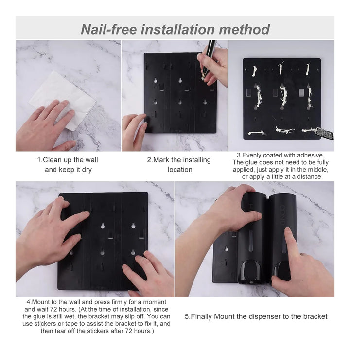 - Monta el dispensador en la pared usando los tornillos y anclajes incluidos, o utiliza cinta adhesiva de doble cara para una instalación sin perforaciones.