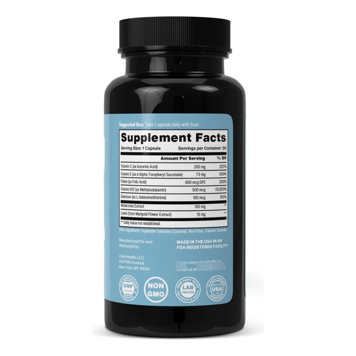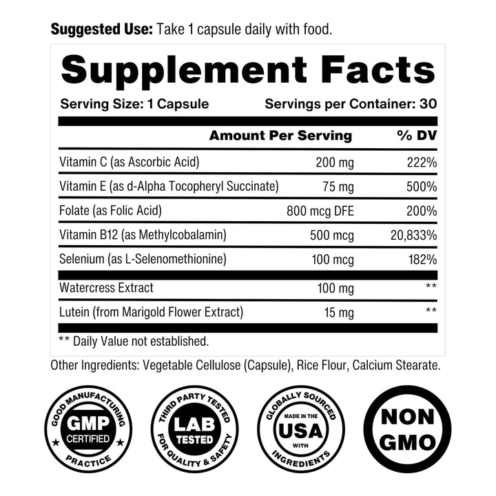 Cada cápsula está formulada con ingredientes de alta pureza como vitamina C, E, folato y selenio, combinados con extracto de berros y luteína para potenciar la reparación celular. Sin ingredientes artificiales, sin OMG y 100% vegano. ¿Por qué conformarte con menos cuando tu cuerpo merece lo mejor?