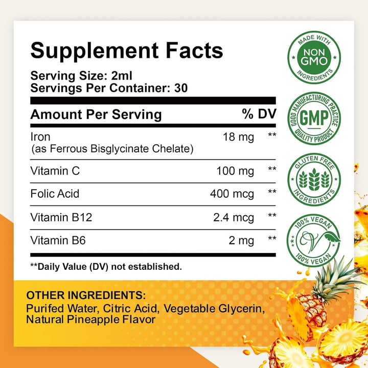Imagina despertar cada mañana con la energía necesaria para enfrentar tus desafíos. Nuestra fórmula mejorada no solo te proporciona hierro altamente absorbible, sino que también incluye nutrientes esenciales como el folato y las vitaminas B6 y B12 para maximizar sus beneficios. Es ideal para toda la familia, desde los más pequeños hasta los adultos, gracias a su delicioso sabor a piña que hace que la nutrición sea un placer, no una obligación.