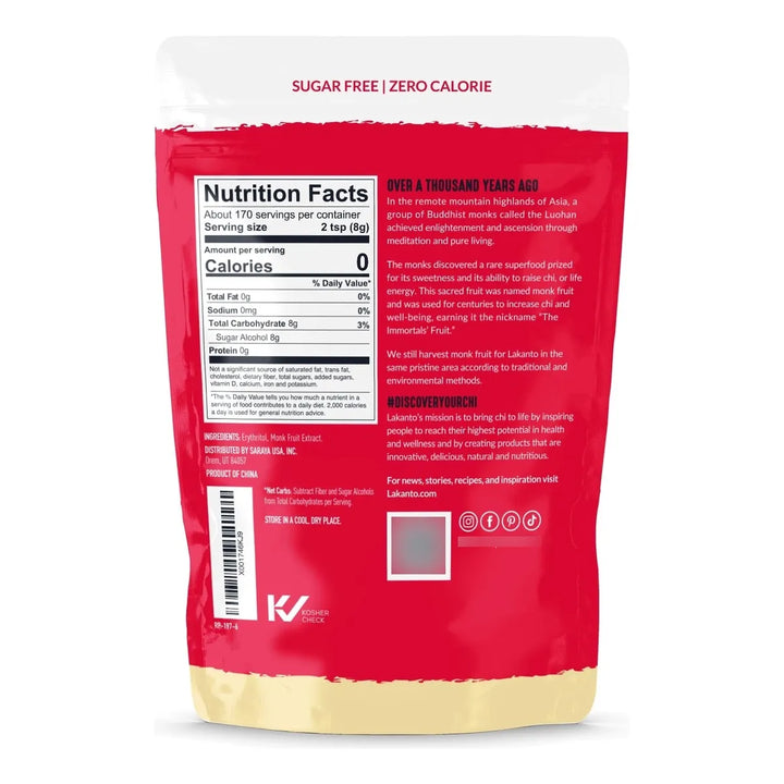 Lakanto Golden logra su dulzor natural a través del extracto de fruta del monje, combinado con eritritol, un alcohol de azúcar que no afecta la glucosa en sangre. Esta mezcla única permite reemplazar el azúcar en cualquier receta, manteniendo el sabor y textura que amas, pero sin los efectos negativos.