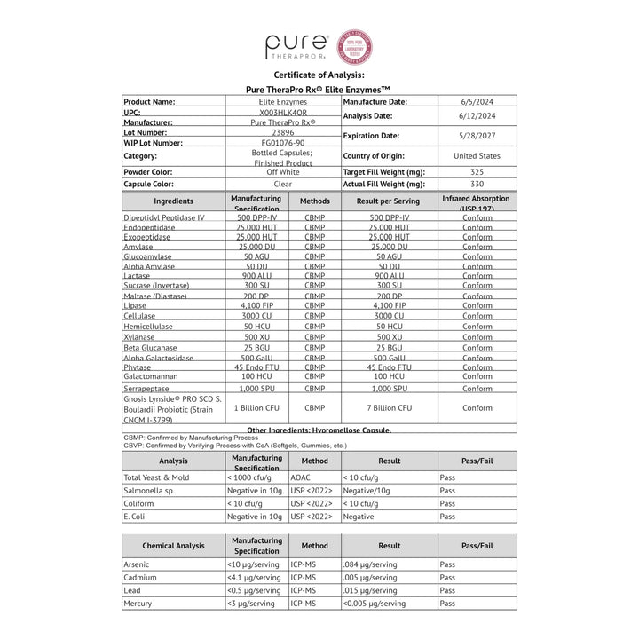 Este no es otro suplemento genérico. Las enzimas de Pure TheraPro son veganas, altamente efectivas y trabajan en armonía con tu cuerpo. No dependen de ingredientes animales como la bilis de buey o el páncreas de cerdo, lo que las hace ideales para cualquier estilo de vida. Además, incluyen enzimas sistémicas como la Serrapeptase, que promueve un equilibrio inflamatorio saludable cuando se toma correctamente.
