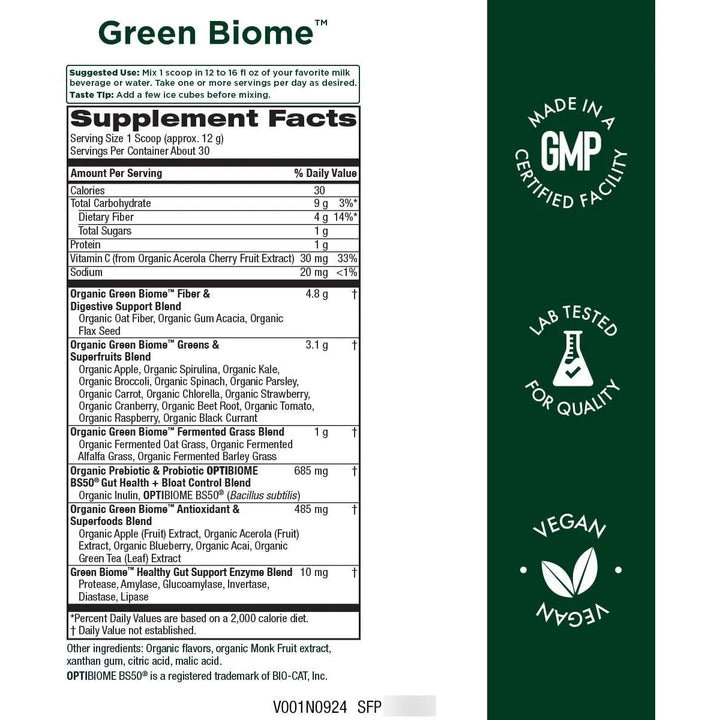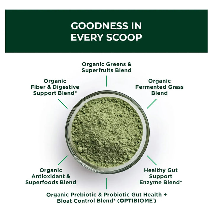 Este superalimento orgánico certificado por USDA está diseñado para cerrar la brecha nutricional que dejan las dietas modernas. Con más de 20 verduras, bayas y superfrutas en cada cucharada, te ayuda a alcanzar las 7-9 porciones diarias recomendadas sin esfuerzo. Pero eso no es todo: su fórmula única incluye 2 mil millones de UFC de probióticos OptiBiome, clínicamente probados para reducir la hinchazón, gases y mejorar la comodidad digestiva.