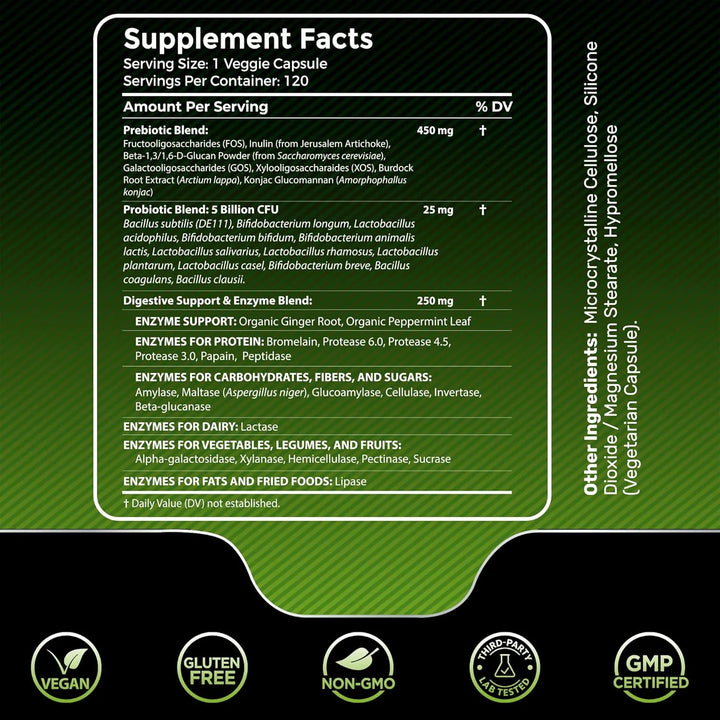 Este no es otro suplemento más. Es una solución científicamente respaldada que combina 450 mg de enzimas digestivas de alta potencia con 5 mil millones de UFC de probióticos clínicamente estudiados. Las enzimas descomponen proteínas, grasas y carbohidratos de manera eficiente, mientras los probióticos recolonizan tu intestino con bacterias beneficiosas. Los prebióticos actúan como combustible para multiplicar su efecto. Juntos, forman un trío imbatible contra los problemas digestivos.