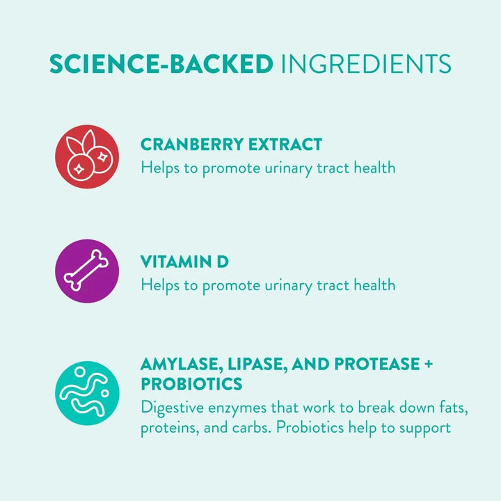Cada cápsula es una poderosa combinación de ingredientes clínicamente estudiados: enzimas como amilasa, lipasa y proteasa descomponen eficientemente grasas, proteínas y carbohidratos, mientras los probióticos equilibran tu microbiota intestinal. El extracto de arándano, la biotina y la vitamina D brindan un apoyo adicional para tu sistema inmunológico y urinario.