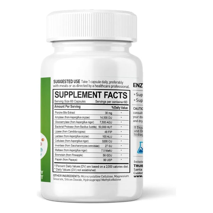 Este suplemento actúa como un refuerzo natural para tu sistema digestivo. Cada cápsula contiene una combinación precisa de enzimas que comienzan a trabajar inmediatamente al contacto con los alimentos. La amilasa descompone carbohidratos, la proteasa ayuda con las proteínas, y la lipasa (junto con el extracto de bilis porcina) se encarga de las grasas. La bromelina y papaína, derivadas de la piña y papaya respectivamente, complementan este proceso para una digestión completa.