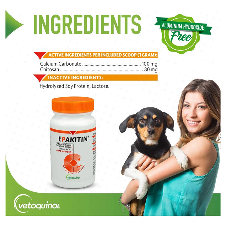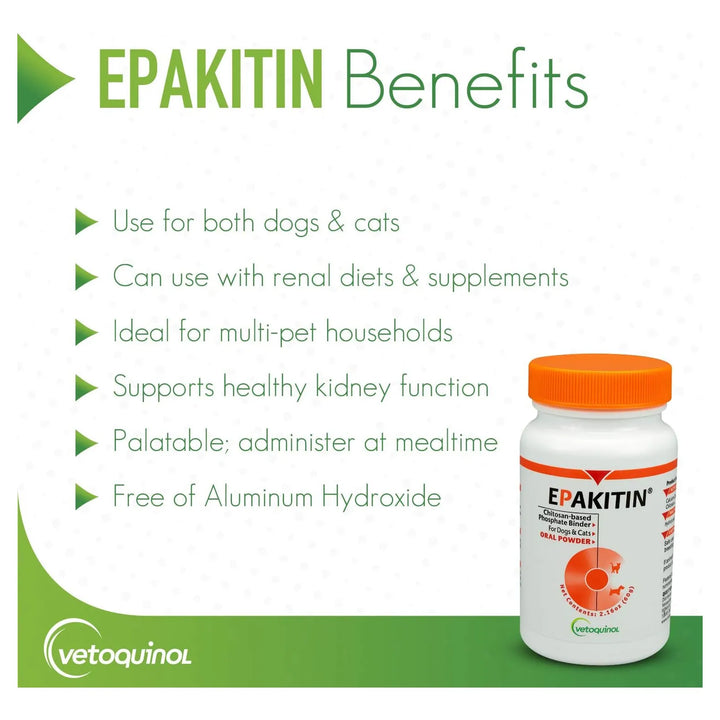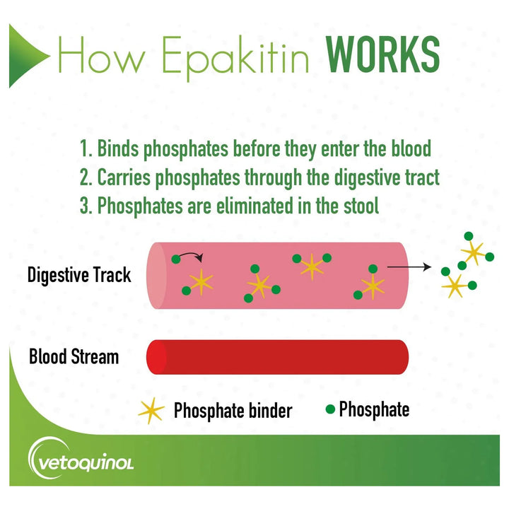 Epakitin actúa como un aglutinante de fosfatos en el tracto digestivo, reduciendo la absorción de fósforo en el torrente sanguíneo. Esto ayuda a disminuir la carga de trabajo de los riñones, permitiéndoles funcionar de manera más eficiente. El quitosano, combinado con carbonato de calcio, forma una barrera que captura el fósforo de los alimentos antes de que sea absorbido, promoviendo así niveles saludables de urea y creatinina.