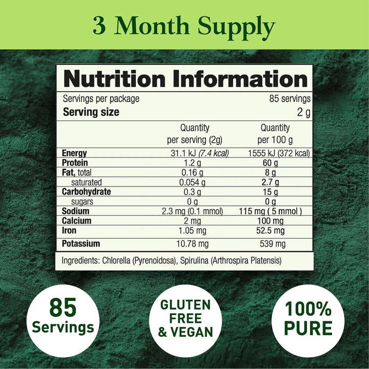 La Espirulina y Chlorella trabajan en conjunto para proporcionar una nutrición celular completa. La Chlorella, con su pared celular rota, libera fácilmente su rico contenido de clorofila, vitaminas y minerales, mientras que la Espirulina aporta proteínas completas y antioxidantes. Esta combinación sinérgica apoya la producción de energía a nivel mitocondrial, promueve la regeneración celular y ayuda al cuerpo a eliminar toxinas acumuladas.