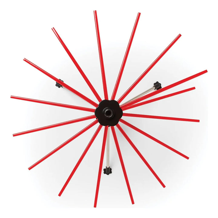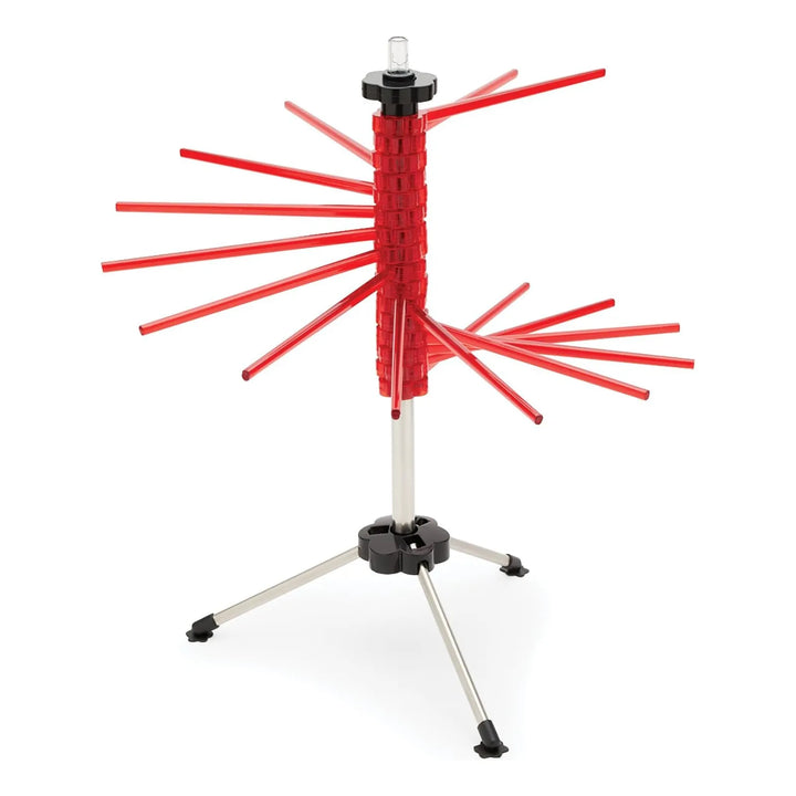 El estante transforma el proceso de secado al distribuir la pasta de manera uniforme sobre sus varillas ventiladas, permitiendo que el aire circule libremente. Esto evita que los fideos se peguen y acelera el secado. Simplemente coloca la pasta recién cortada sobre las varillas usando la varita incluida, gira los brazos según necesites, y guárdalo plegado cuando termines.