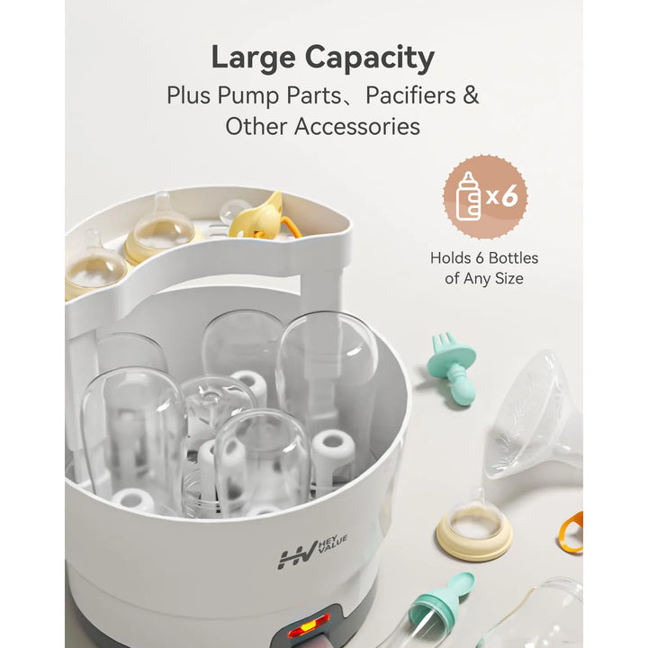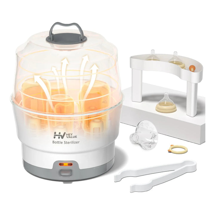 ¿Te imaginas poder esterilizar los biberones, chupetes y accesorios de tu bebé en solo 6 minutos, sin esfuerzo y con la tranquilidad de eliminar el 99.9% de las bacterias? El Esterilizador Eléctrico HEYVALUE es la solución que toda madre y padre ocupados estaban esperando. Diseñado para simplificar tu rutina, este dispositivo no solo ahorra tiempo, sino que protege lo más valioso: la salud de tu pequeño.