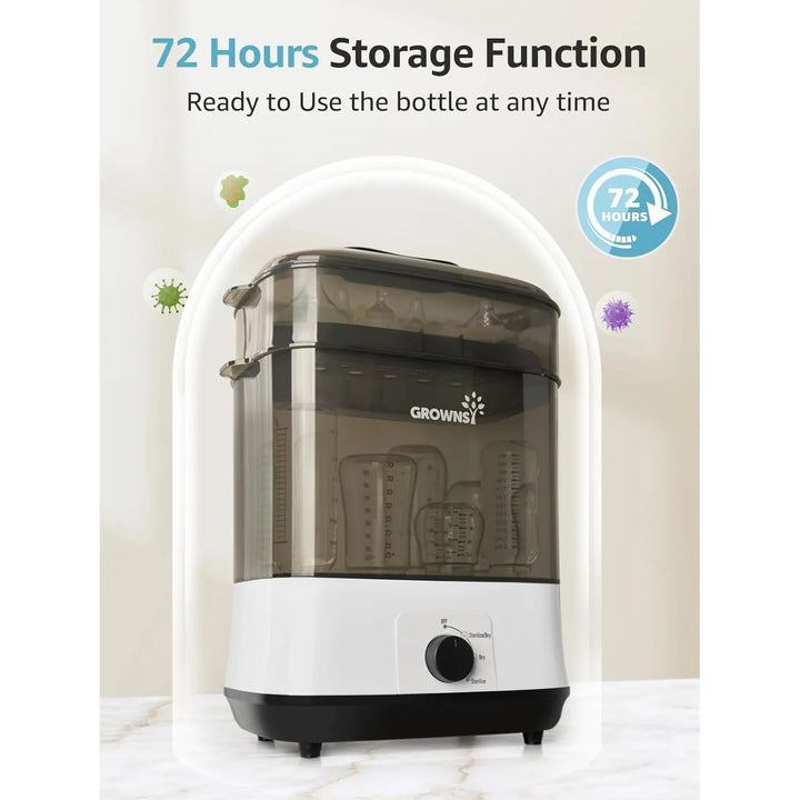 No todos los esterilizadores son iguales. Mientras otros te dejan con biberones húmedos y sin protección contra bacterias, el GROWNSY no solo esteriliza, sino que también seca y almacena. Con tres modos de uso (esterilización, secado o ambos), se adapta a tus necesidades en cada momento. ¿Lo mejor? Después de esterilizar, cambia automáticamente al modo de almacenamiento, manteniendo todo desinfectado por más de 72 horas. Olvídate de volver a esterilizar antes de cada uso.