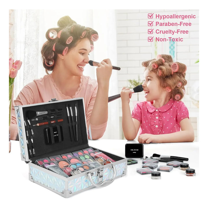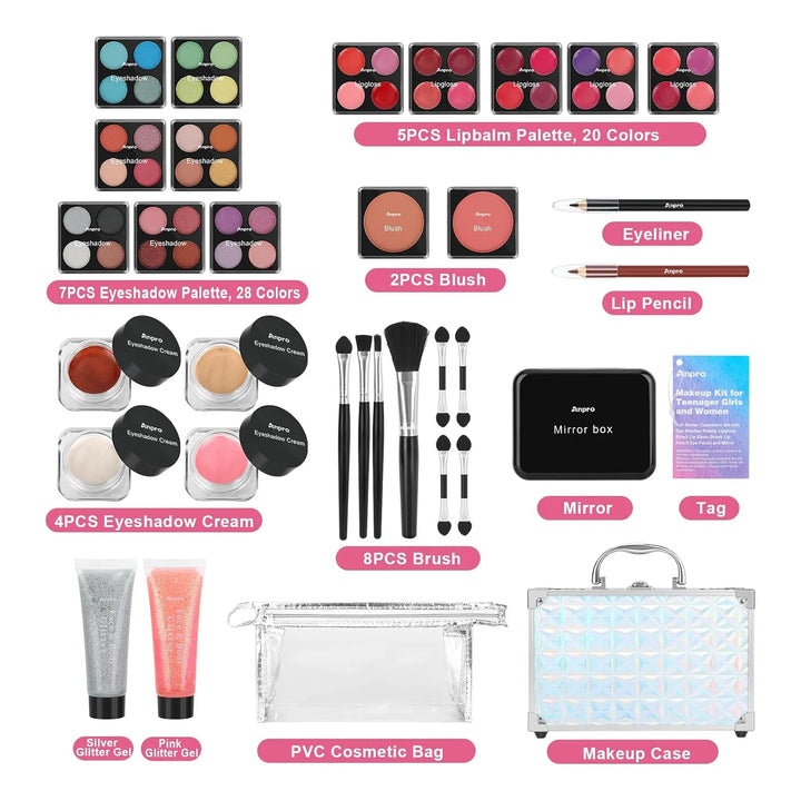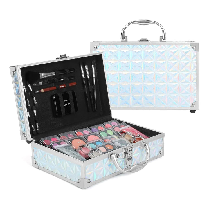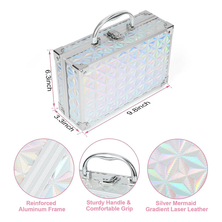 Este kit profesional incluye 7 paletas de sombras (28 colores), 5 bálsamos labiales (20 tonos), rubores, cremas, purpurinas y más, todo diseñado para adaptarse a todo tipo de piel. Su estuche elegante con asa y tela láser sirena no solo luce increíble, sino que protege tus cosméticos mientras viajas. ¡Di adiós al desorden y hola a la creatividad sin límites!