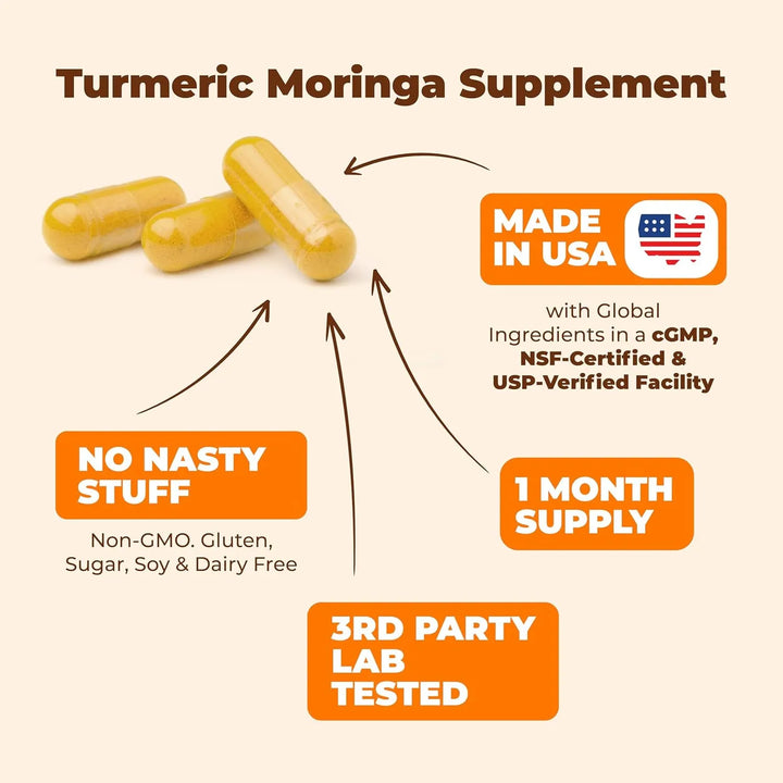 Nuestro suplemento actúa en sinergia para brindarte beneficios integrales. La curcumina reduce la inflamación y apoya la salud articular, mientras que la moringa proporciona energía y nutrientes esenciales. La pimienta negra asegura que estos compuestos sean absorbidos eficientemente por tu cuerpo.