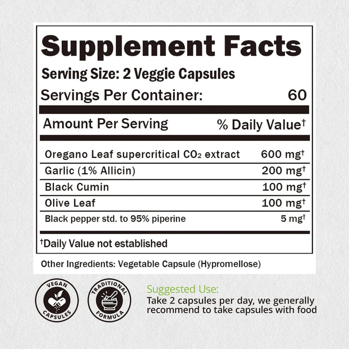 - 🌿 Defensas a prueba de todo: Combate amenazas estacionales con 600 mg de extracto de orégano silvestre en cada porción.