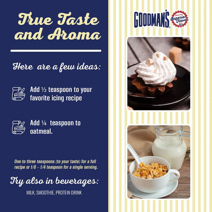 El extracto de arce Goodman's concentra el sabor natural del jarabe de arce en una fórmula fácil de usar. Su proceso de extracción preserva los compuestos aromáticos clave, lo que permite que unas pocas gotas infundan un sabor rico y equilibrado en tus preparaciones. ¡Así de simple!