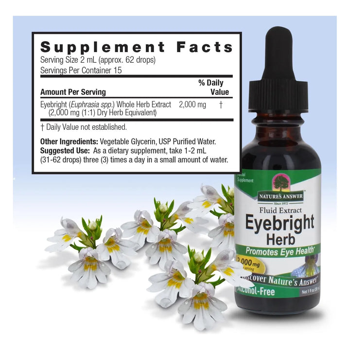 El Eyebright contiene componentes activos que actúan como astringentes naturales, ayudando a limpiar y refrescar los ojos. Sus propiedades antiinflamatorias suavizan las membranas mucosas irritadas, brindando alivio rápido y duradero. Al ser un extracto fluido, su absorción es rápida, permitiendo que los beneficios comiencen a notarse en poco tiempo.