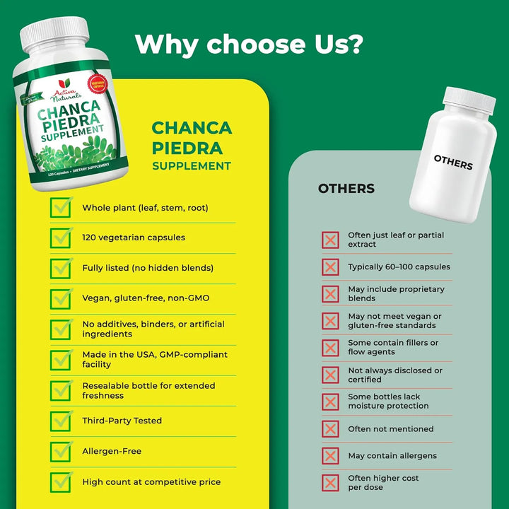 ¿Te preocupa la acumulación de toxinas o depósitos minerales en tu cuerpo? Chanca Piedra, conocida como "rompepiedras", actúa de manera suave pero efectiva para promover el equilibrio interno y ayudar a eliminar lo que tu cuerpo no necesita. Cada cápsula está diseñada para brindarte la potencia y la consistencia que necesitas para mantener una función renal saludable, sin efectos secundarios ni complicaciones.