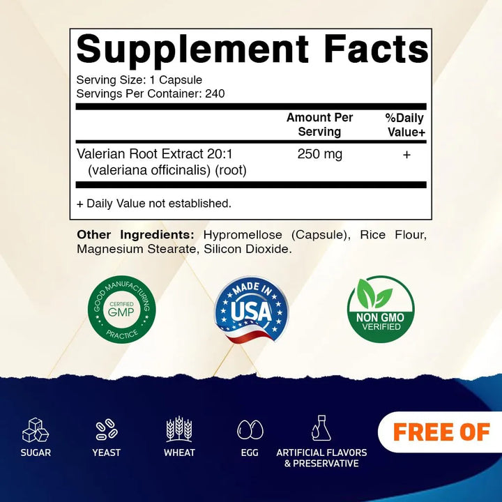La vida moderna puede ser abrumadora: estrés, ansiedad y falta de sueño afectan tu rendimiento y felicidad. Nuestro extracto de valeriana, libre de OMG, gluten y aditivos artificiales, es la alternativa segura que estabas esperando. Fabricado en EE.UU. bajo estrictos estándares GMP, cada cápsula ofrece 250 mg de potencia pura para restaurar tu equilibrio interno. ¿No mereces sentirte mejor cada día?