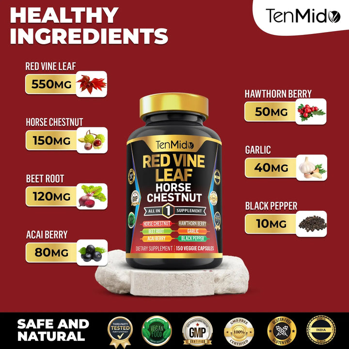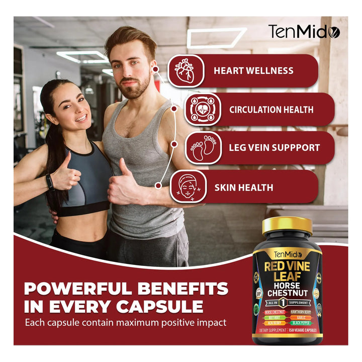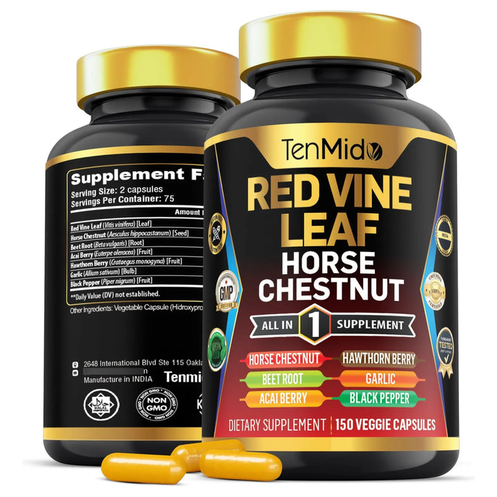 Cada ingrediente ha sido cuidadosamente seleccionado y dosificado para garantizar la máxima absorción y potencia. La hoja de vid roja, con una proporción de extracto de 20:1, es solo el comienzo. El castaño de indias (15:1), la raíz de remolacha (20:1) y las bayas de acai y espino (20:1) aportan nutrientes esenciales que tu cuerpo agradecerá. Además, el ajo y la pimienta negra mejoran la biodisponibilidad de los componentes, asegurando que no se pierda ni una gota de beneficio.