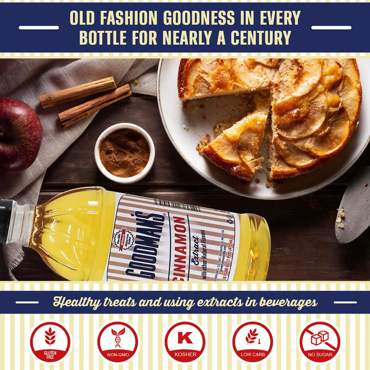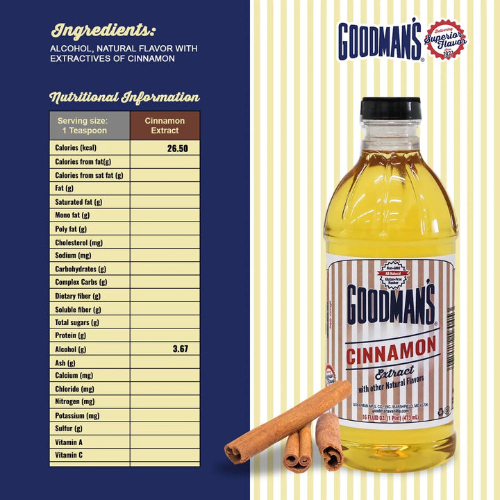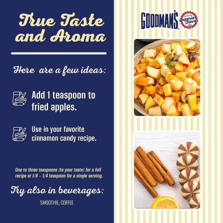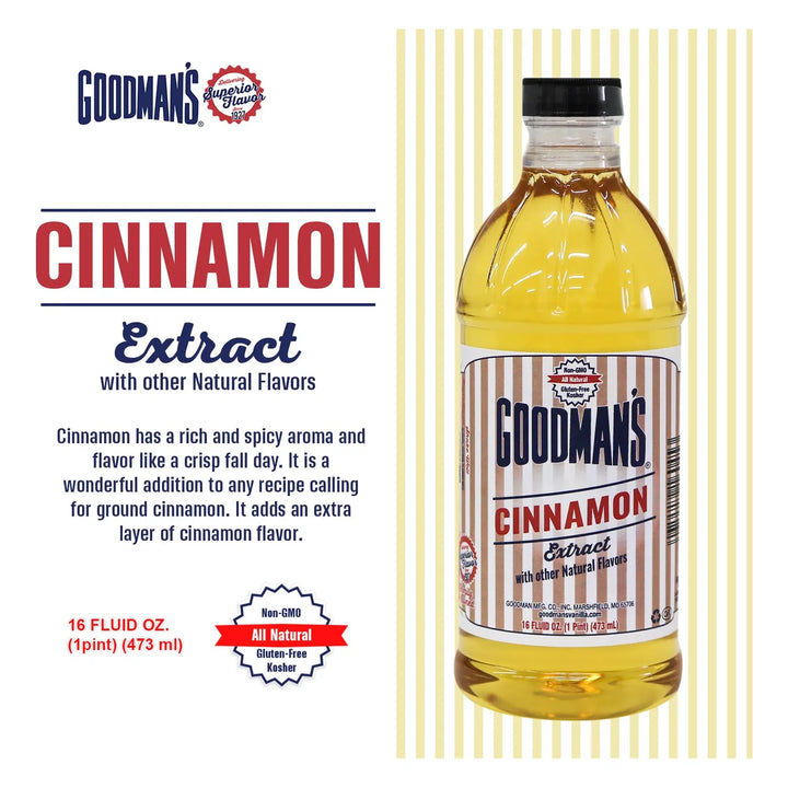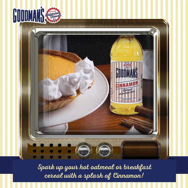 El extracto de canela Goodman's concentra los aceites esenciales de la canela de la más alta calidad, logrando un sabor y aroma intensos que se liberan al contacto con el calor. A diferencia de la canela molida, su forma líquida permite una distribución uniforme en cualquier preparación, asegurando que cada bocado esté lleno de su delicioso sabor.