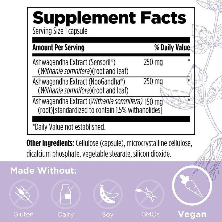Este producto utiliza tres formas de ashwagandha estandarizadas para garantizar potencia y eficacia. El extracto Sensoril® (250 mg) reduce el cortisol hasta un 24% según estudios. La tecnología liposomal en NooGandha™ aumenta la biodisponibilidad de los withanoides I y II en un 300% comparado con polvos comunes. Y el extracto completo de planta asegura el "efecto séquito" de los fitoquímicos naturales.