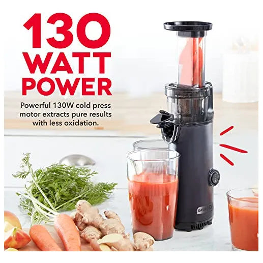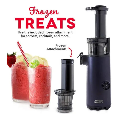 El Extractor de Jugo Dash Dcsj255 utiliza un sistema de prensado en frío que rompe lentamente las fibras de frutas y verduras, extrayendo hasta la última gota de jugo sin generar calor. Esto evita la oxidación y preserva las vitaminas, minerales y enzimas naturales. El resultado es un jugo más nutritivo, con mejor sabor y textura.