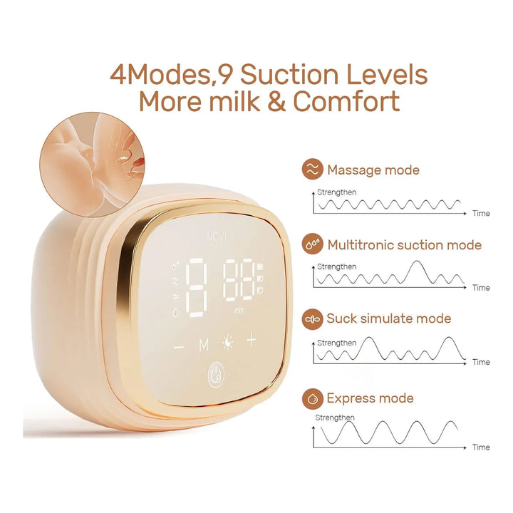 El Extractor De Leche Doble Portátil NCVI utiliza tecnología avanzada para imitar el patrón de succión natural de tu bebé. Primero, el modo de masaje estimula tus senos para prepararlos. Luego, puedes elegir entre los modos de succión multitrónica, estimulación o bombeo expreso, ajustando la intensidad según tu comodidad. El sistema cerrado evita pérdidas y garantiza una extracción eficiente.
